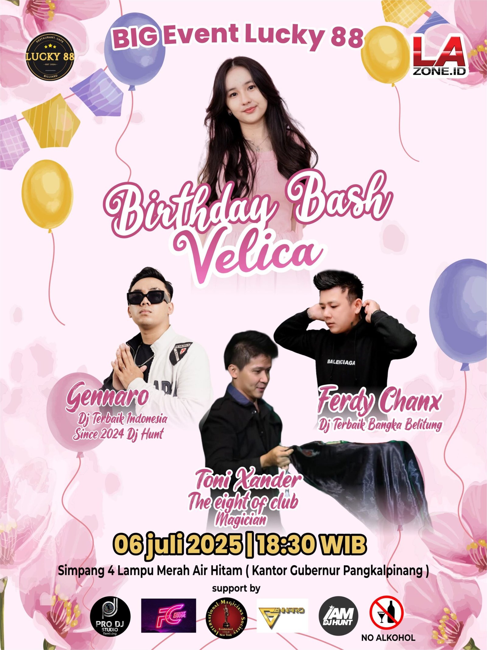 Bahkan owner dari Resto and Cafe ini pun mengajak seluruh rekan ,sahabatnya untuk hadir dalam acara ulang tahun putrinya yang bernama Velica , dengan Tema “Birthday Bash Velica” yang bertempat di Lucky 88, Simpang Empat Lampu Merah Air itam .