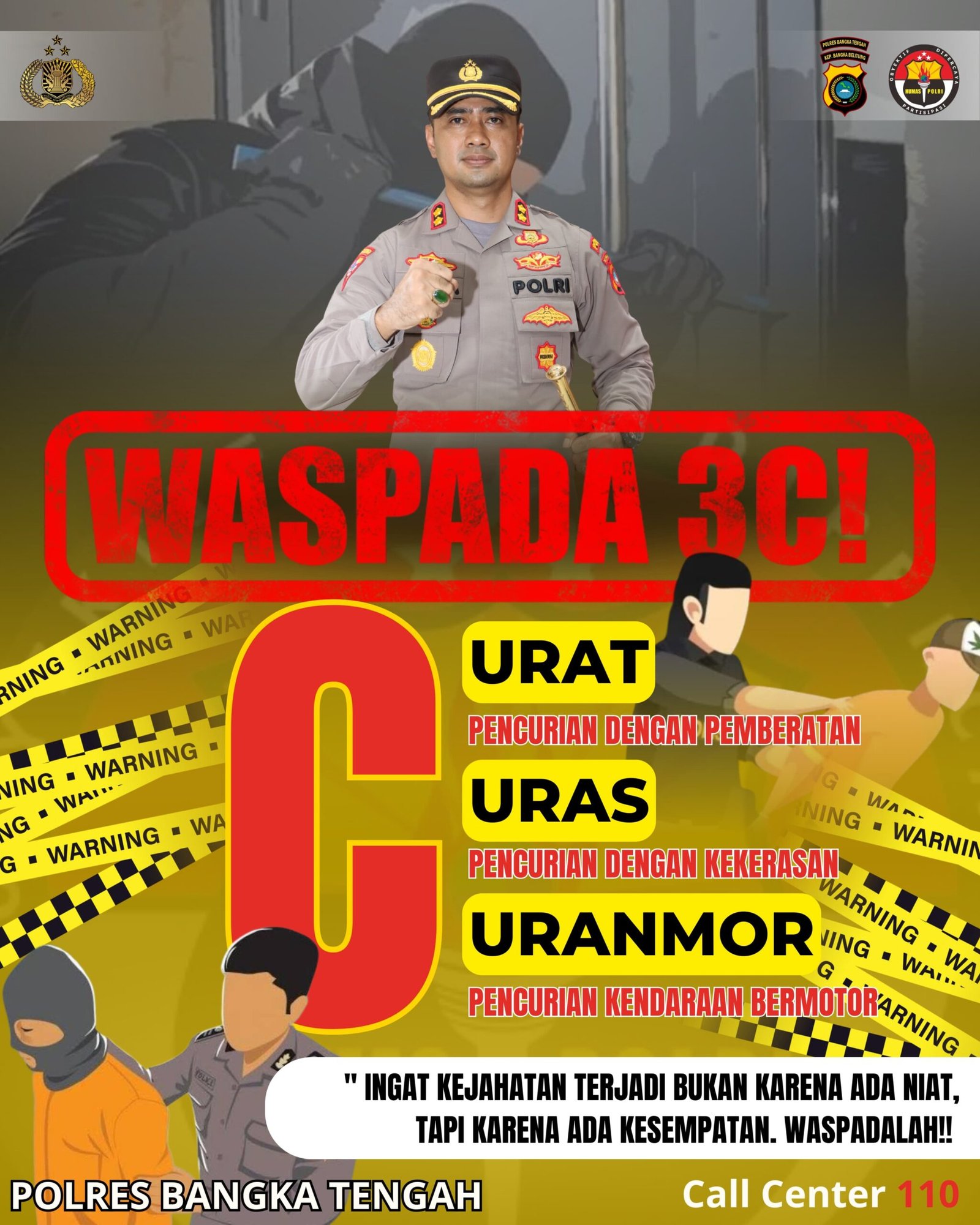 Polres Bangka Tengah mengimbau kepada seluruh masyarakat untuk meningkatkan kewaspadaan terhadap ancaman tindak kejahatan yang dikenal dengan istilah 3C: