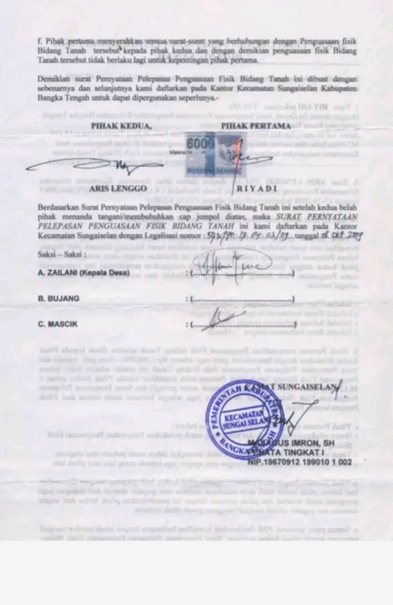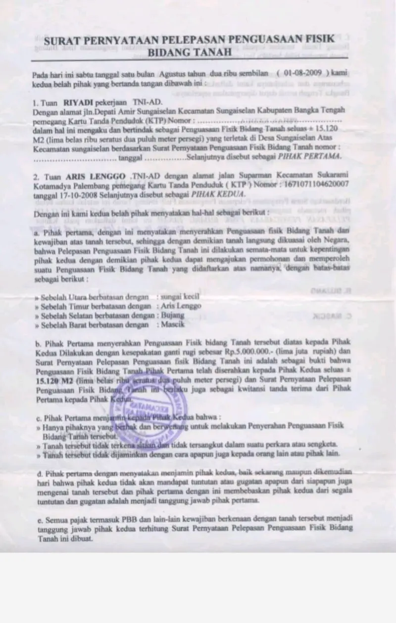 Surat pernyataan pelepasan hak penguasaan fisik tersebut menurut Aris Lenggo dikeluarkan oleh pihak Kecamatan Sungai Selan pada tanggal (01/08/2009) dengan luas bidang tanah lebih kurang 15.120 meter persegi.