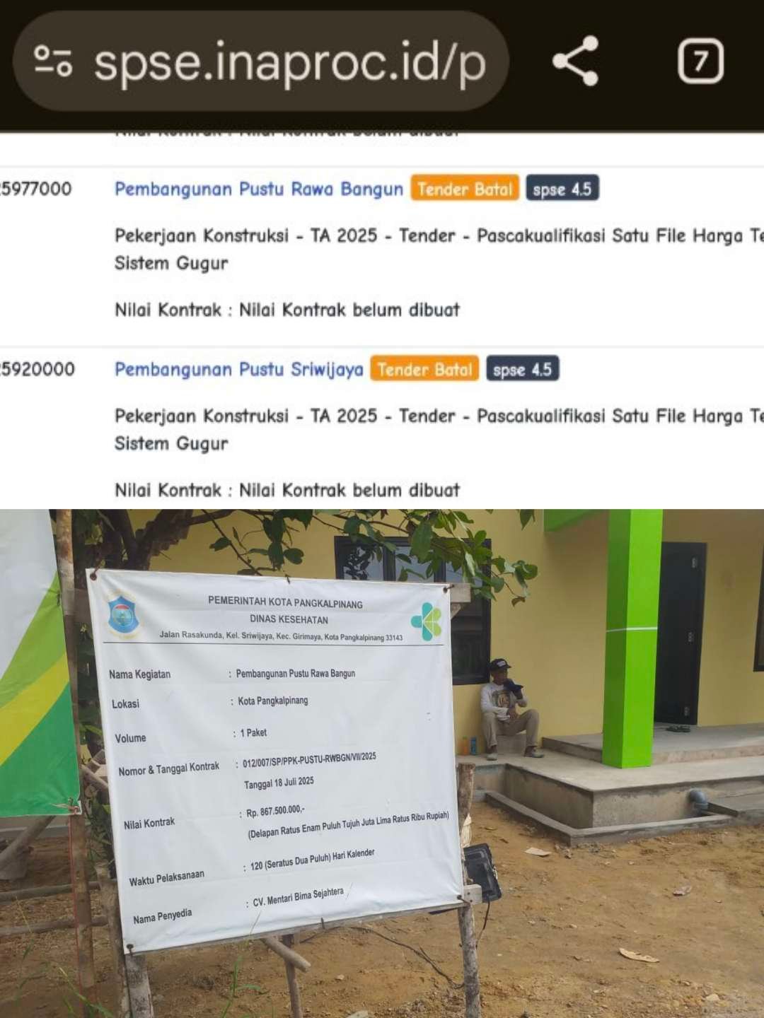 Pangkalpinang — Publik kembali dikejutkan dengan temuan ganjil dalam proyek Pembangunan Pustu (Puskesmas Pembantu) Rawa Bangun di bawah Dinas Kesehatan Kota Pangkalpinang. Berdasarkan data resmi di laman LPSE/SPSE (spse.inaproc.id), proyek tersebut berstatus “Tender Batal” dengan keterangan belum ada nilai kontrak maupun pemenang lelang.